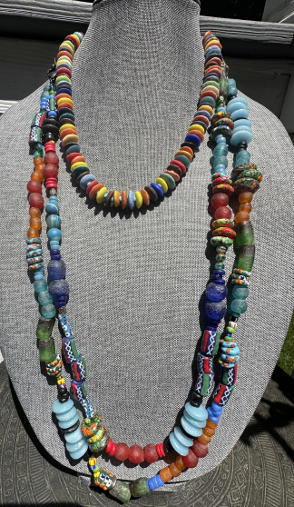 The Collete collection: Hand-painted Krobo Beads (powder glass made by the people of the Krobo Mountain, Ghana, West Africa-reproducing old Venetian fancy trade glass), recycled glass plastic and fused rondelle recycled beads, and glass seed beads.